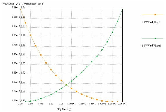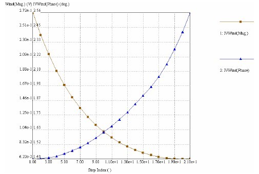 | 根据设置可知,磁芯从中心位置向右移动20mm,共分为21个步骤。计算之后可以得到各个线圈上的感应电压随着磁芯的运动而变化的曲线。下图是左侧第一感应线圈上的感应电压和相位随着磁芯移动的变化曲线。 |