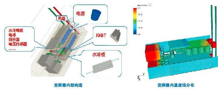 船用变频器为典型的高功耗小尺寸的设备,其中的IGBT、水冷电阻等都是高功耗器件,因此,只采用常规的强迫风冷是无法满足设备使用温度要求的。在散热设计中,采用风扇风冷的方式将设备内的热空气抽出,保证较低的设备内部环境温度,对于IGBT和水冷电阻等高功率器件采用局部水冷的液冷方式散热,从而很好的满足设备的使用温度条件。6SigmaET软件可方便的导入复杂外型的IGBT等模型,软件有液冷设备的冷板、泵、冷管等以及电容、电感等电子器件模型可方便建模。