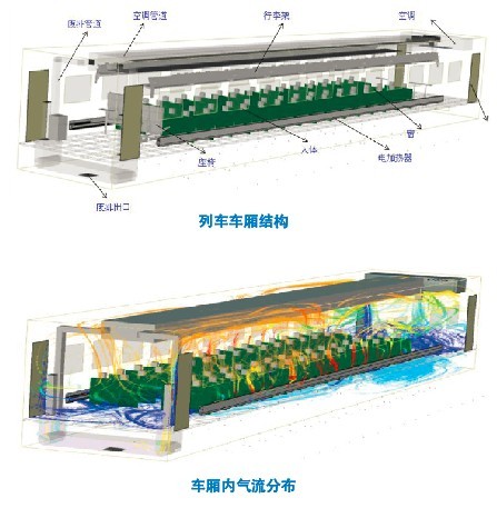 列车车厢内控温,夏季采用上部空调管道向下送冷风,上部回风口回热风;冬季采用空调供暖和车厢内电加热器辅助供热的组合供暖方式,以满足车厢内人体舒适度要求。