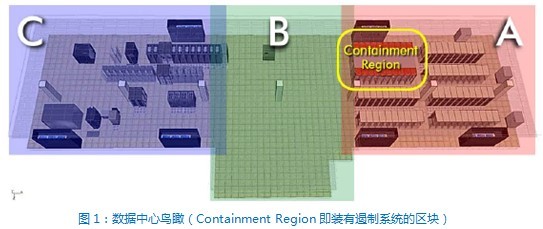 如图1,面积为8600平方英尺的数据中心的房间被分成了三个专用区域。ABC是一整个未分隔的房间的三个区域。A区使用了80Wright Line机柜,装有一级的 EIA-310服务器设备。