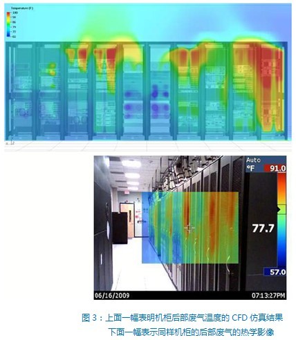 如图3所示,机柜后面废气温度的CFD模拟结果与实际测量所得的热学图像是相符的。Wright Line利用CFD的详细结果来更好的理解遏制区的情形。