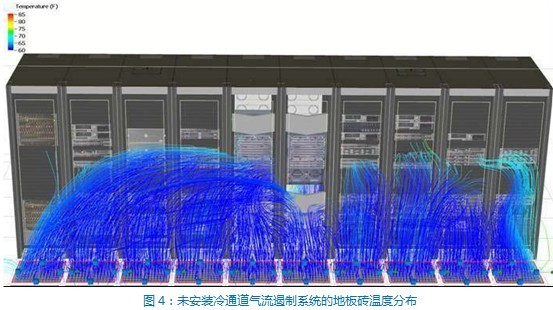 图4表明了没安装冷通道气流遏制系统的地板砖气流的仿真学视角。CFD仿真结果表明,架子上方和行末的设备入口有微量的空气直接从空调单元传来。从地板砖传来的空气不能满足安装在架子上的设备对气流量的要求。