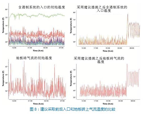 BayCare中心将一些打孔的地板砖用带格子的砖代替并更换了机房空调的一些组件来增加气流的供应量。他们用密封工具来弥补机柜内的泄漏区并且关闭了含风扇的后门板上的几个风扇。这些改变所造成的结果被标在图8中。