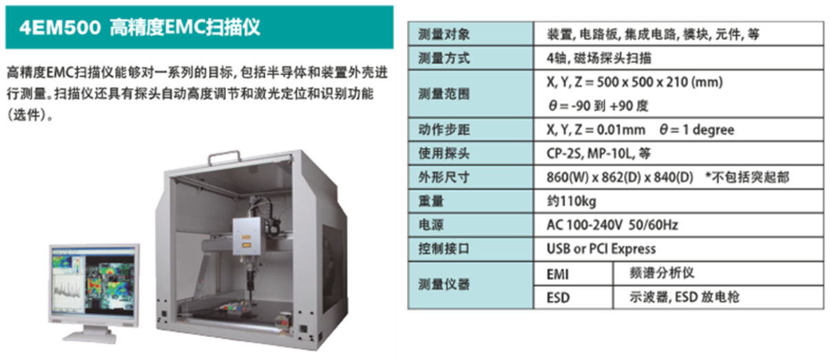 表面扫描的磁场探头扫描法(Magnetic probe method:MP法)是NEC公司最早开发出的检查方法。NEC公司把自己开发的MP法提案中所使用的磁场探头的技术规范提交IEC组织,经IEC组织标准修订程序审核,正式形成 IEC 的国际标准IEC61967-6。NEC公司的2款EMC扫描仪(4EM200/4EM500)符合国际标准。此外,NEC公司可以根据客户需要提供测量范围在 9kHz-18GHz的磁场探头。 (1)小型EMC扫描仪 4EM200